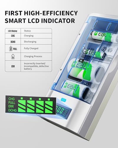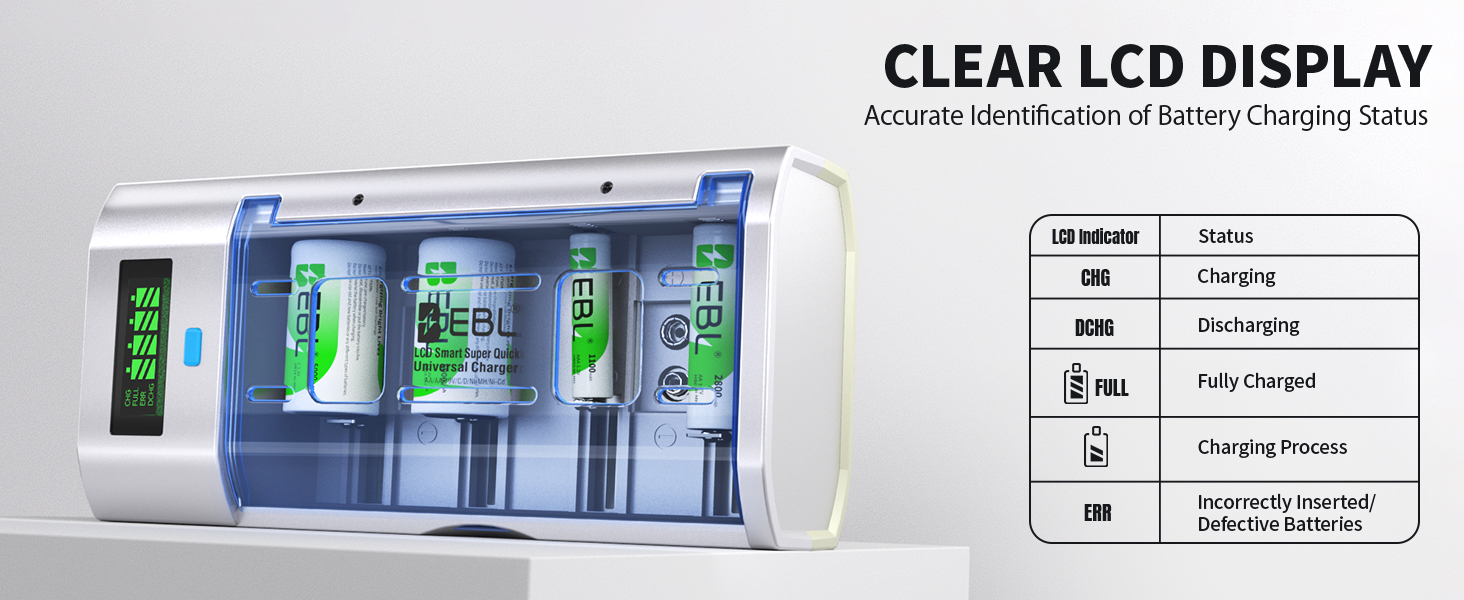 - 【Charge with Unmatched Clarity】 This EBL charger features an advanced LCD screen that clearly displays real-time battery status: CHG (Charging), DCHG (Discharging), FULL (Fully Charged), and ERR (for incorrect insertion or faulty batteries). With this intelligent visual guidance, you can manage power with confidence, ensure optimal charging, and instantly identify any issues—making power management smarter and safer than ever.