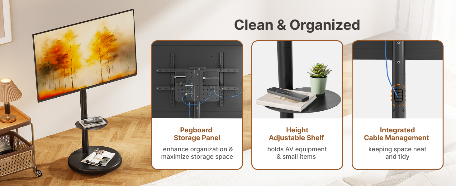 Powerful Storage and Cable Management: Maximize your space with the stand's powerful storage options. Featuring an adjustable bracket, built-in cable management system, and a pegboard for additional storage, this TV stand helps you keep your entertainment area organized and clutter-free.
