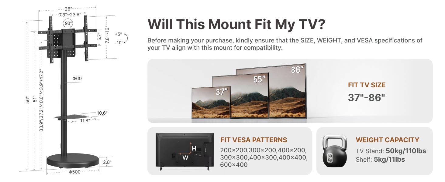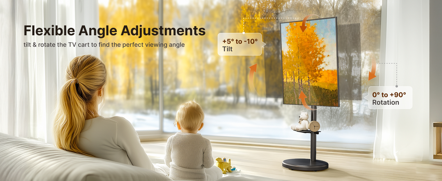 Flexible TV Angle Adjustment: Enjoy complete flexibility with the ability to adjust the TV angle. The stand supports tilt adjustments from -5° to +10°, as well as a 0-90° rotating screen, enabling you to easily find the perfect viewing angle for any setting.