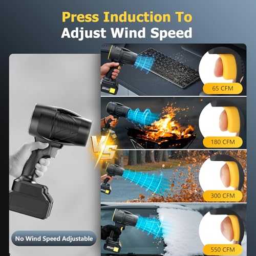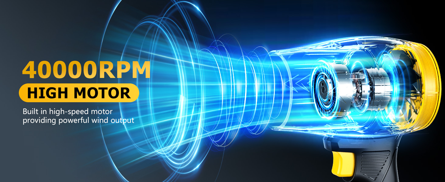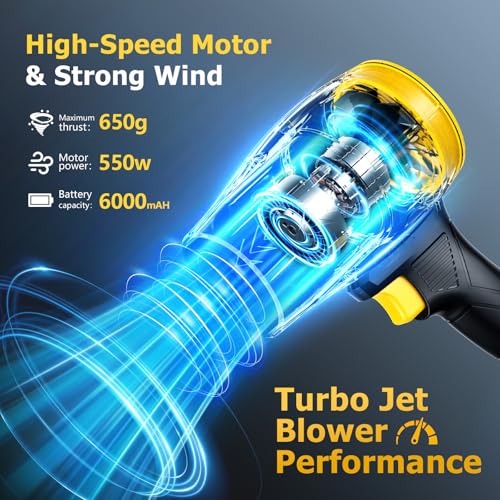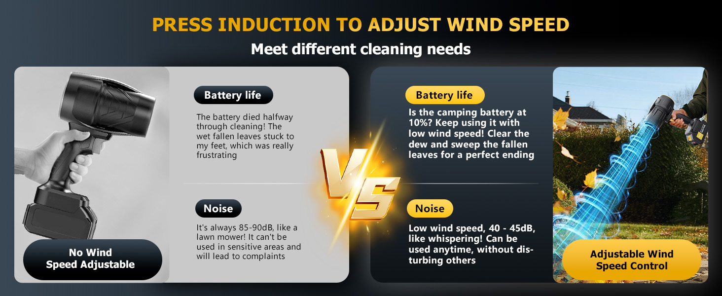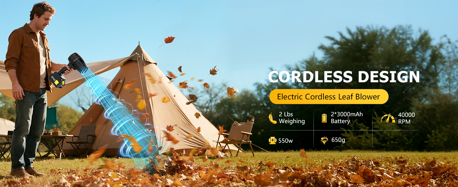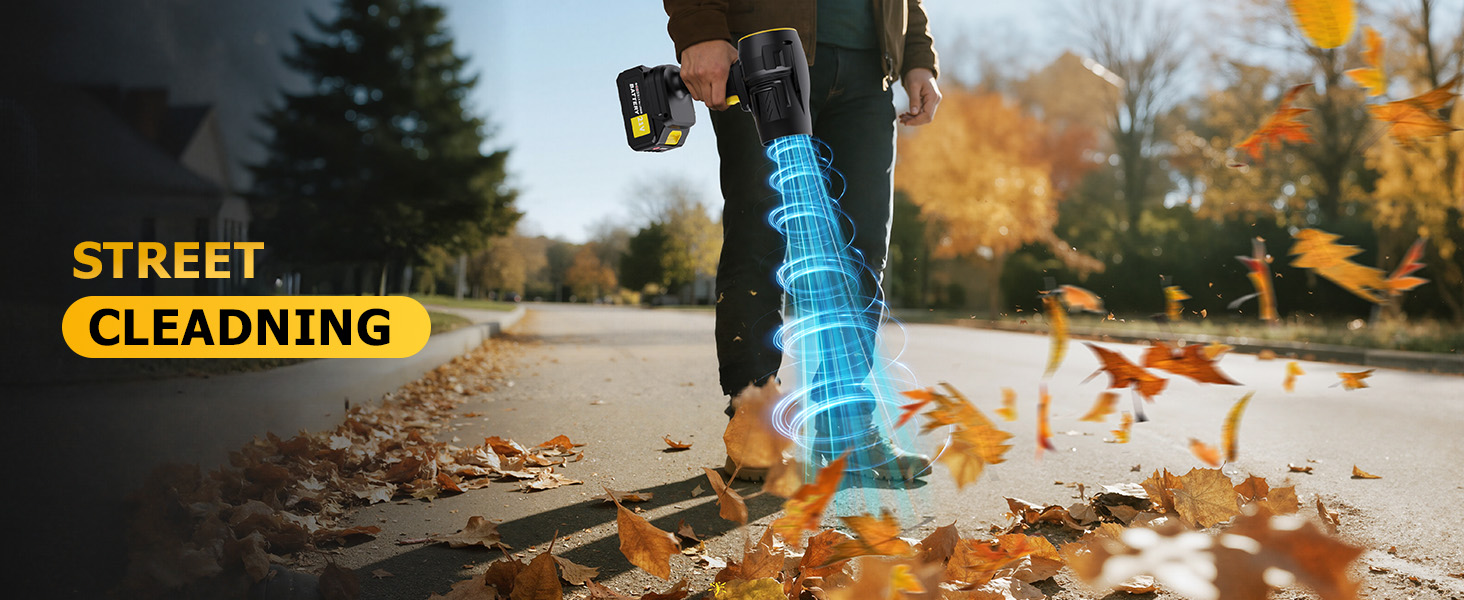 550W Powerful High-Speed Motor:This handheld leaf blower is equipped with a high-performance motor of 400,000RPM, which can output a maximum of 60M/s of strong wind speed and up to 700G of thrust. The powerful wind generated by the electric cordless leaf blower instantly blows away the damp and heavy fallen leaves, broken branches, and gravel on the ground. The can easily handle various heavy courtyard cleaning tasks and demonstrate excellent cleaning efficiency.