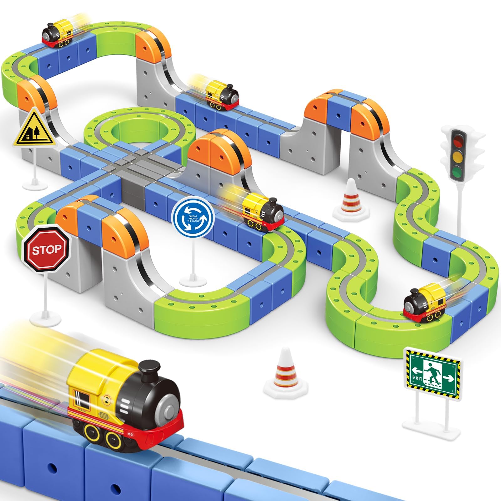 - Multiple Ways to Play: The flexible metal track allows for endless layout possibilities. Thanks to powerful 360° magnetic force, the electric train can travel uphill, downhill, sideways, and even upside down. DIY signs add an extra layer of fun and realism to every race