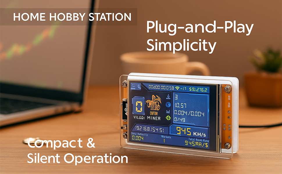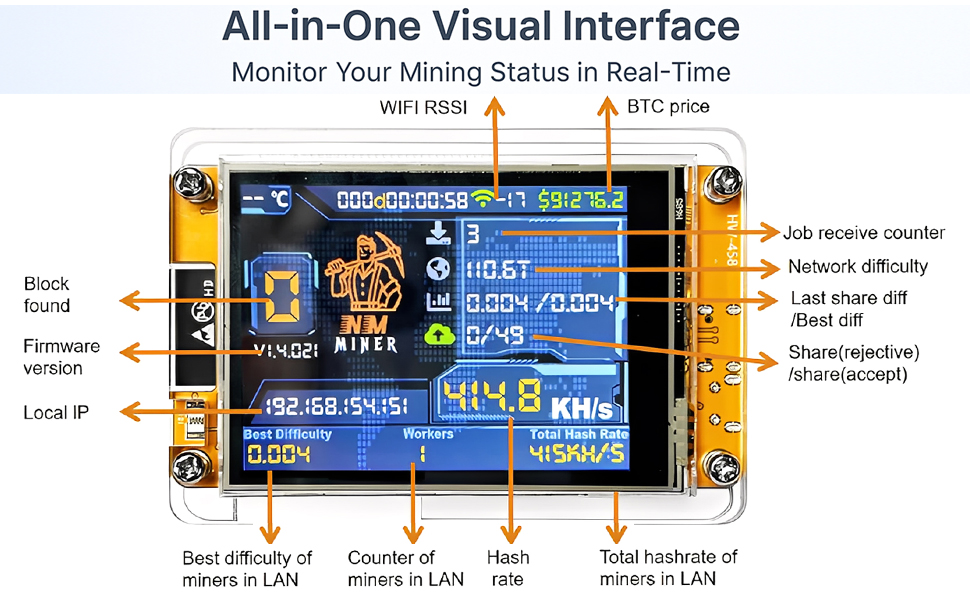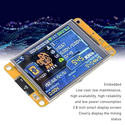 - Visual Interface: This miner is equipped with an support for ESP32 S3R8 MCU WiFi microcontroller and a 2.8 inch smart display, which clearly shows mining status, as well as hash rate and power consumption information. Instant and efficient feedback helps check mining performance and enhances operational convenience.
