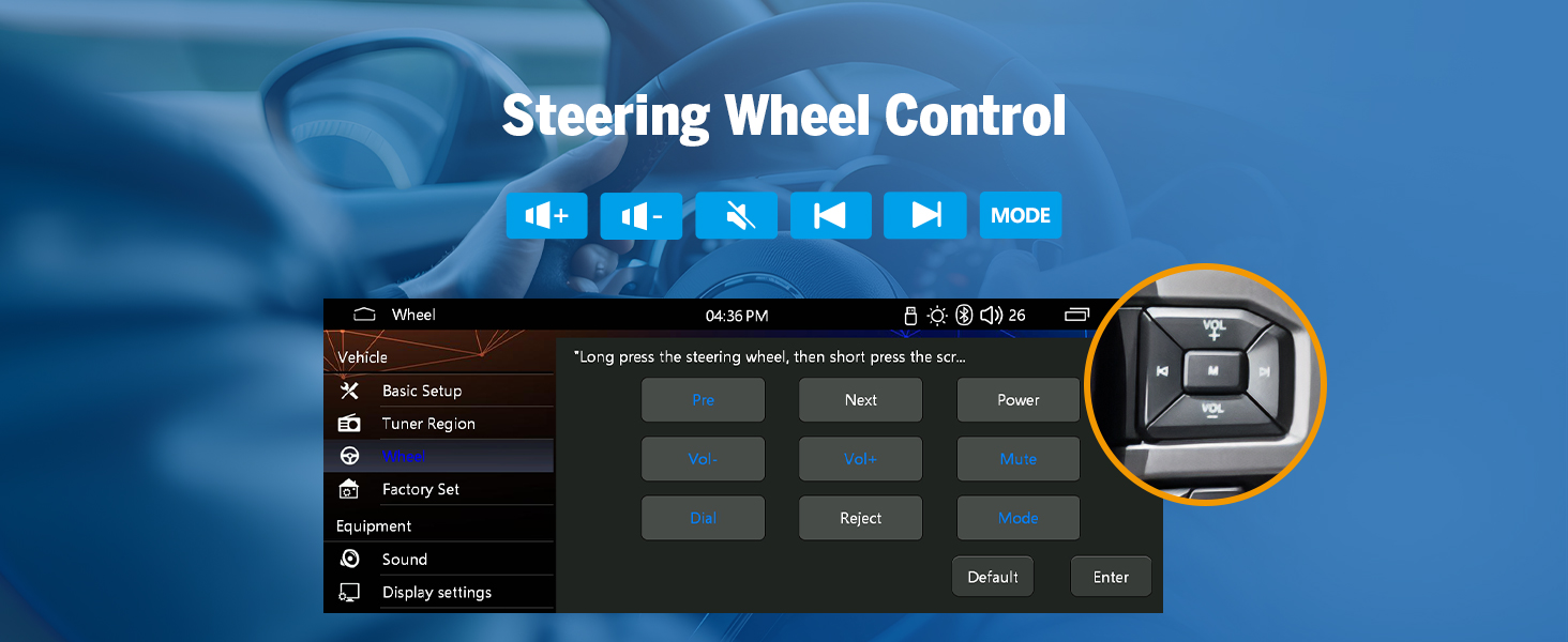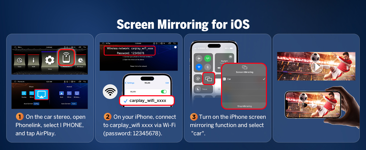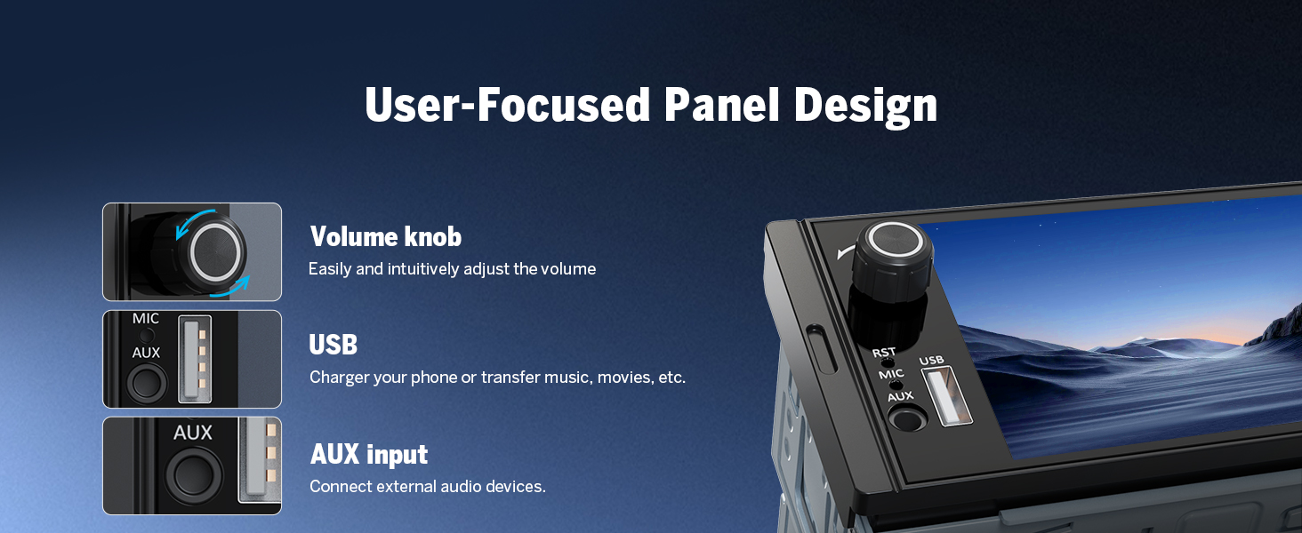 - Supports screen mirroring; Supports steering wheel control; Physical volume control; Supports clock display; Supports playback memory when the device is powered off; Supports rear view camera