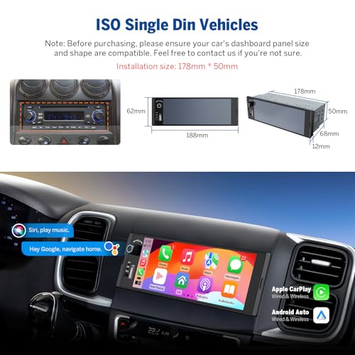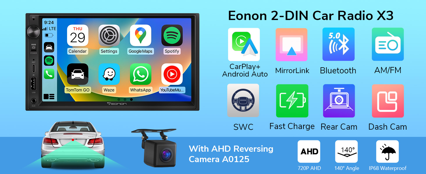 Eonon 6.36 inch Single Din Wireless Carplay Android Auto Touch Screen Car Stereo Radio Bluetooth screen mirroring USB EQ Video IN/OUT AUX Backup Camera USB X3U