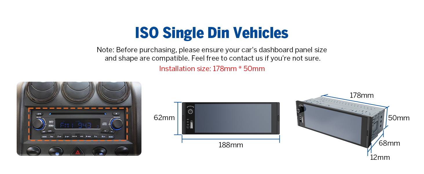 | Applicable models | ISO 1 DIN Size; (Note: Before purchasing, please confirm the size and shape of your center console panel. If the installation size of your car's center console is inconsistent with the size of our machine, please be sure to consult first.) |