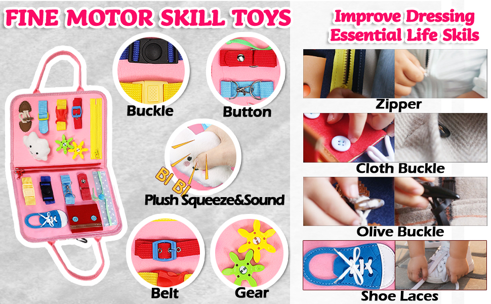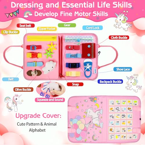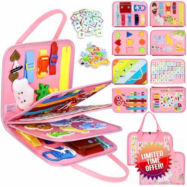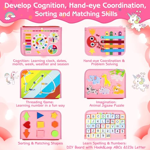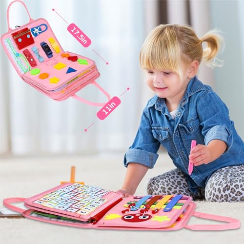 Esjay Busy Board Toddlers Toys, Montessori Busy Book for Fine Motor Skills Learning, Gifts for Girl Toddler Birthday, Toy for Travel Plane Car Activities, Sensory Early Educational(MultiPage Pink)
