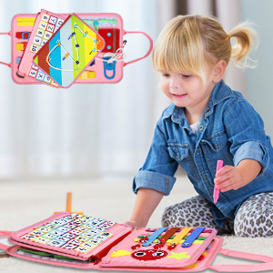 - [PLAYFUL LEARNING] – Keep your toddler happily engaged while they develop basic life skills from dressing and fine motor skills to finger dexterity. The octopus button page is designed to enhance hand-eye coordination. Develop cognitive skills with the clock, calendar, and weather page. Recognition and imagination are strengthened through the shape matching activity and fun jigsaw puzzles. Toddler can learn spelling and numbers through the hook&loop letters board and fun number threading game.