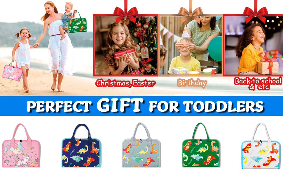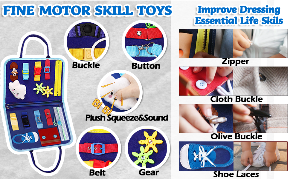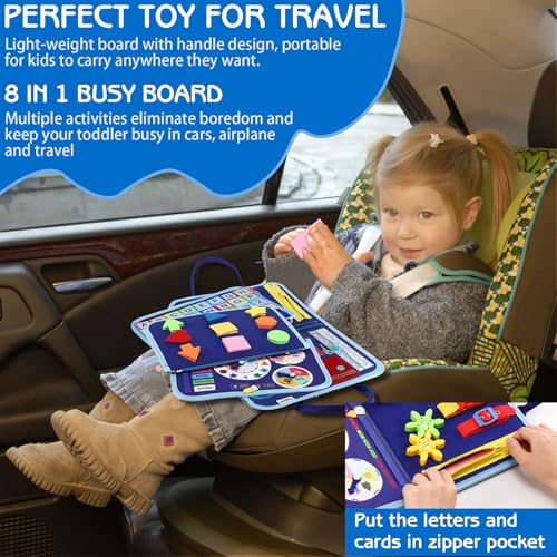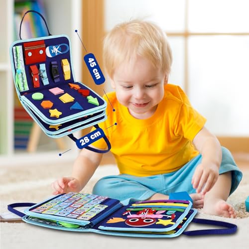 - [SOFT & PORTABLE TRAVEL TOYS]: Our Montessori toys sensory toys for toddlers is crafted from non-toxic soft fabrics and felt with no hard edges for worry-free play. With a handy carry handle, this busy board is a great travel toys for tiny hands and fits effortlessly into diaper or school bags. Great toddler toys sensory board to encourage quiet, focused play while on car, plane, travel or settings needing quiet.