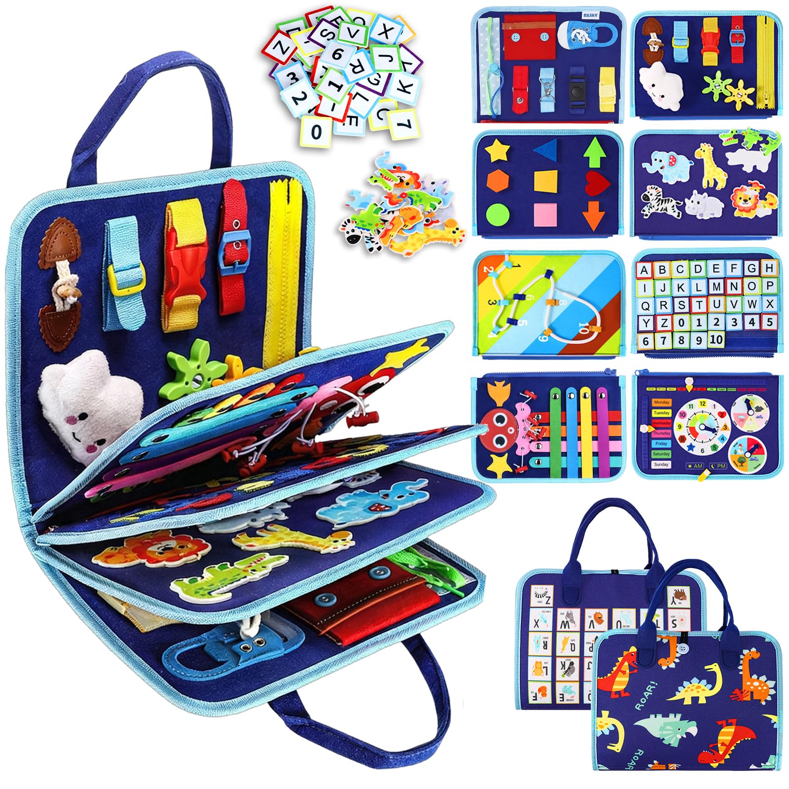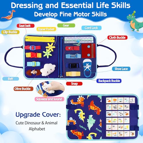 - [A THOUGHTFUL GIFT]: Made with quality and care, Esjay Montessori toddler busy board is a good choice as gifts, sturdy enough to hold up to toddler’ s use. The covers are printed with cute dinosaur pattern and animal alphabet, makes it a decent Christmas and birthday gift for toddler boys and girls.