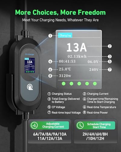 - 【Charging Customisation】 Equipped with a 2.4" LCD screen, this home EV charger provides real-time tracking of critical metrics including temperature, charging duration, and current intensity. Its Type 2 to 3 pin cable supports adjustable amperage from 6A to 13A for circuit optimization, alongside programmable delayed start intervals (0–12 hours in 2-hour increments) to leverage off-peak electricity tariffs