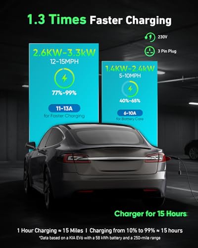 - 【Enhanced Power Delivery】The 3 pin EV charger delivers up to 3.1 kW charging power through its Type 2 cable, operating at a maximum current of 13A to achieve accelerated charging speeds of 10–16 miles per hour—30% faster than conventional 10A home chargers. Designed for universal compatibility with 110–250V mains sockets, this electric vehicle charger enables efficient charging across residential, outdoor, and portable scenarios where standard 3-pin outlets are accessible