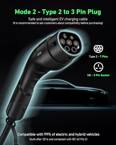 - 【Built for Safety & Stability】 Certified to UKCA, CE, and RoHS standards, the 3 pin EV charger incorporates multi-layered protections against overheating, voltage surges, and short circuits. The Type 2 charging system automatically terminates sessions upon full battery detection, while its BS-compliant plug and TUV-tested wiring ensure adherence to stringent UK electrical safety protocols