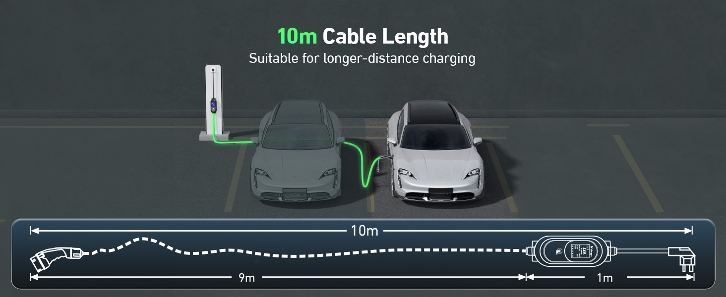 Length Options: 6/8/10/15m (from 3 pin plug to Type 2 plug including control box). We recommend choosing the length that is at least 2-3 metres longer than the direct distance between the parking space and socket to ensure flexible charging.