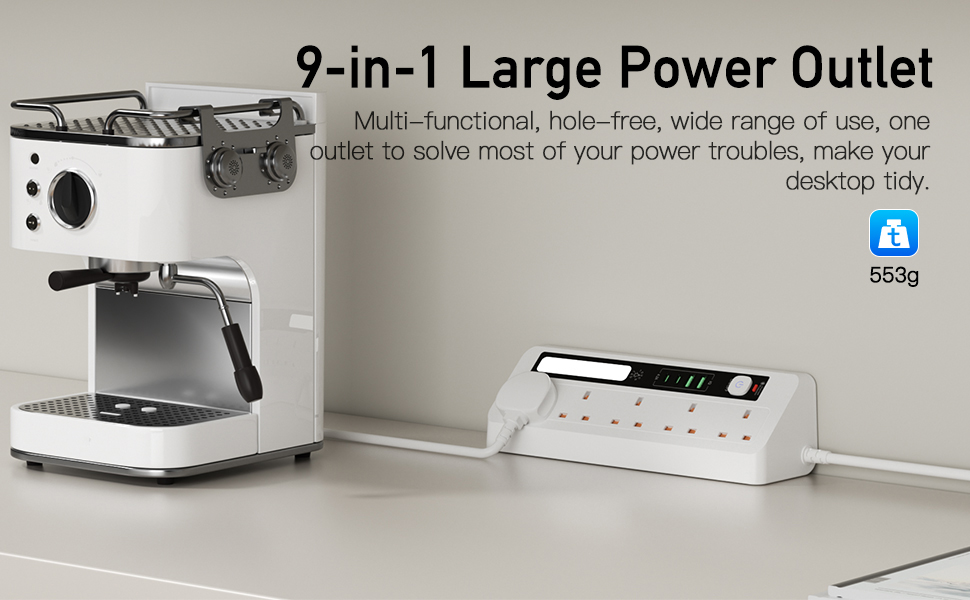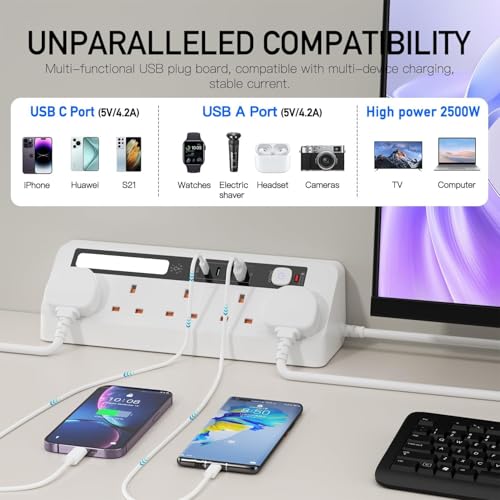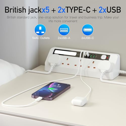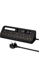 - 9 in 1 Power Strip:The multiple power strip is equipped with 5 AC outlets, 2 USB A+2 USB C, USB output: 5 V-4.2 A.It can quickly charge your mobile phone, tablet computer and other devices.Max capacity up to 2500W