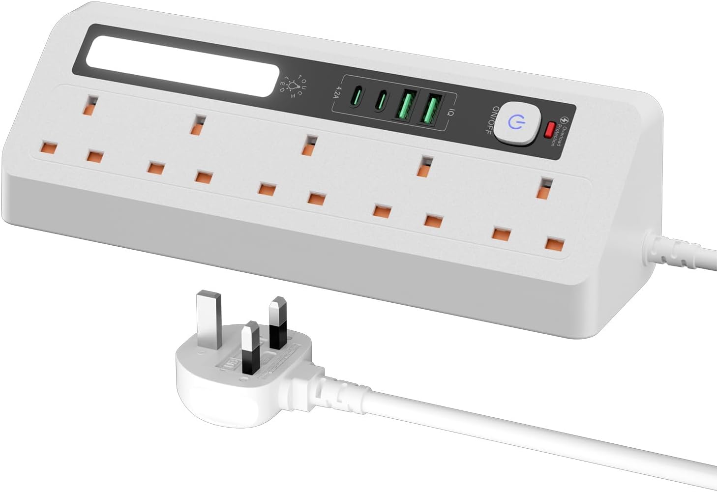 Extension Lead with 2 USB and 2 Type-C, 5 Way Corner Power Strip with Touch Night Light, Surge Protection with 1.8M Cable for Home and Office (White)