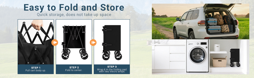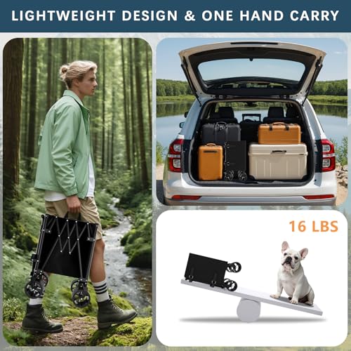 Compact and Portable Design: Weighing just 18lbs, this foldable trolley can be collapsed to a small size, reducing storage space by up to 85%. This makes it easy to store in your car trunk or a tight closet. The quick, tool-free setup lets you unfold and fold the wagon in seconds.