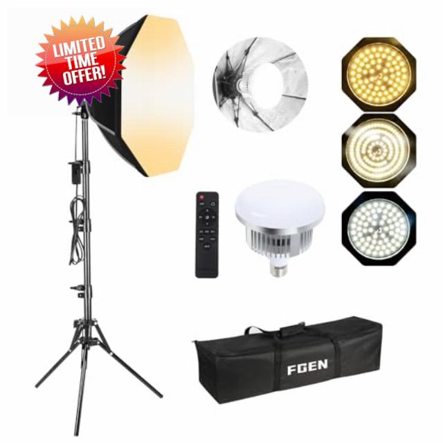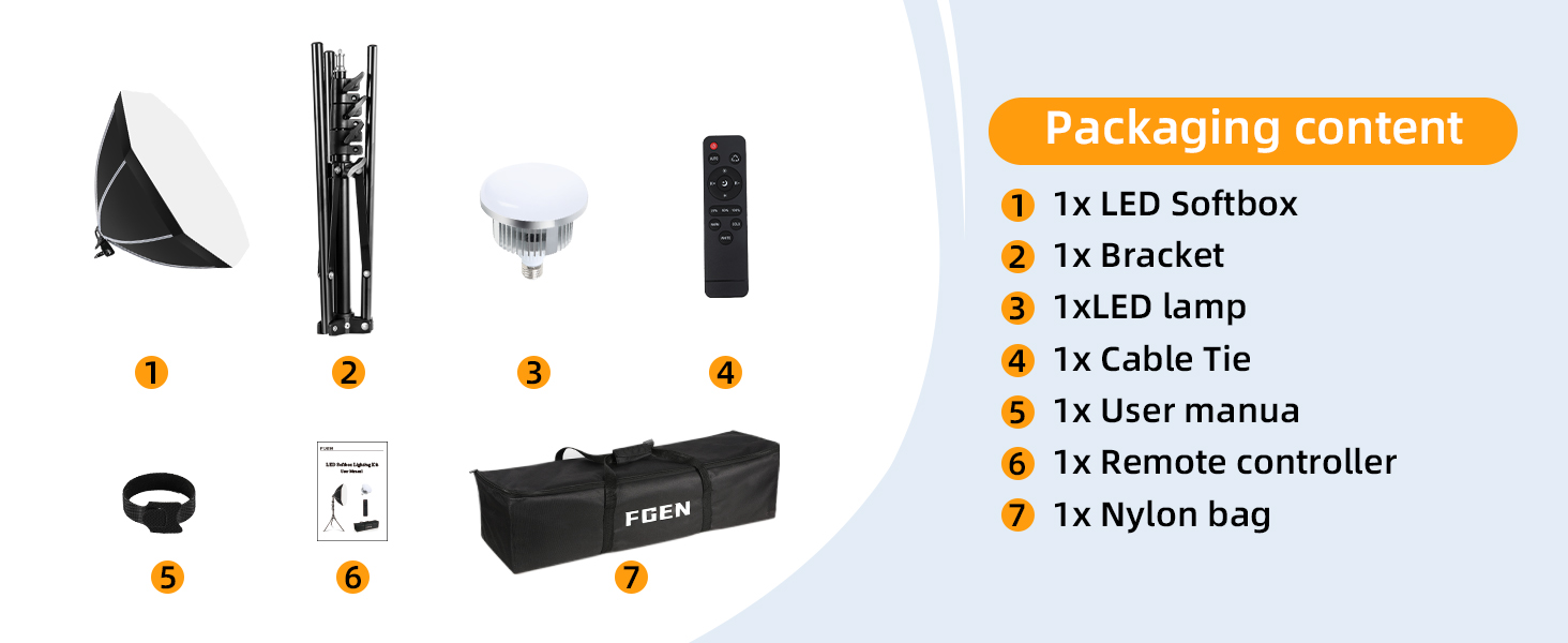 Complete Softbox Kit.Includes 1x50cm Oktagon Softbox,1x150cm Tripod,1x60W LED Bulb,1xRemote Control,1xNylon Bag,1xUse Manual and 1xVelcro Strap.FGen will provide replacements for lost/damaged accessories for soft box.