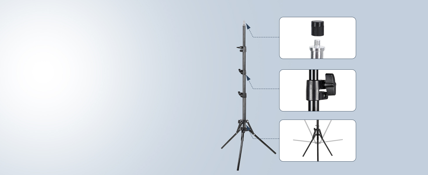 Easy Height and Angle Adjustment.The 3-section retractable length allows the tripod can be folded to 40cm and risen to 150cm.The studio light head can be rotated by 210° for optimum illumination angle.