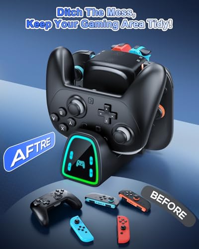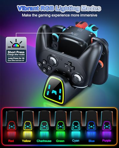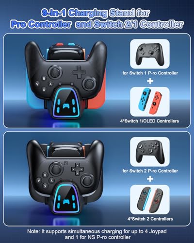 - 【Wide compatibility】: This 9 in 1 charging port dock for Nintendo Switch 2/1 offers fast charging function and can simultaneously power up to 4 controllers for Joy Con1/2 and a Pro Controller for Switch 1/2. NOTE: NOT COMPATIBLE WITH THIRD-PARTY CONTROLLERS. Combining charging, storage, and RGB lighting in one sleek, compact station, it provides the ultimate convenience and efficiency, keeping your controllers organized, charged, and ready for your next gaming session