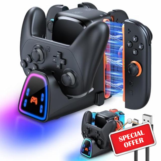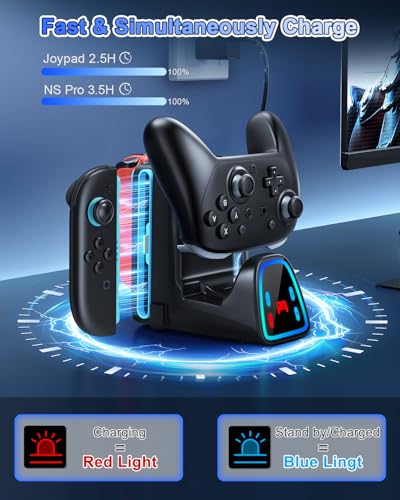 - 【Efficient Charging】: The versatile docking station for Switch 2/1 supports fast charging, fully powering the Joypad in 2.5 hours and the Pro Controller in about 3.5 hours, ensuring you're always ready for your next gaming session. Equipped with an advanced smart chip, it delivers safe and efficient power, preventing overcharging, overheating, and short-circuiting to keep your controllers fully protected