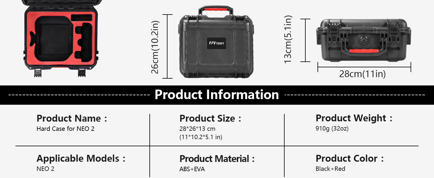 - 【Product Information】 Shell Material: PP, Inner Material: EVA, Dimensions: 28 × 26 × 13 cm Weight: 910 g Package List: 1 × NEO 2 hard case, 1 x shoulder strap . (Note: This product does not include the drone or other accessories!)