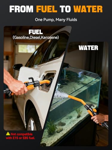 - Multifunctional & Widely Used: This fuel syphon pump safely transfers a wide range of fluids including gasoline, gas, diesel, kerosene, water, and more. It's the ultimate time-saving tool for refueling gas can, cars, boats, lawn mowers, snowblowers, or for filling aquariums and RV fresh water tanks. Please note: Not compatible with E15/E85 fuel, corrosive liquids and FMD fuel cans.