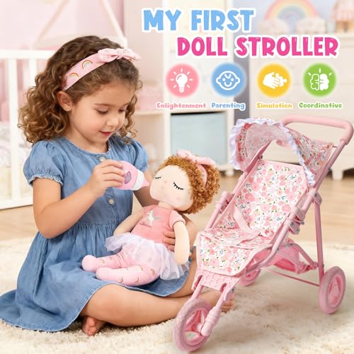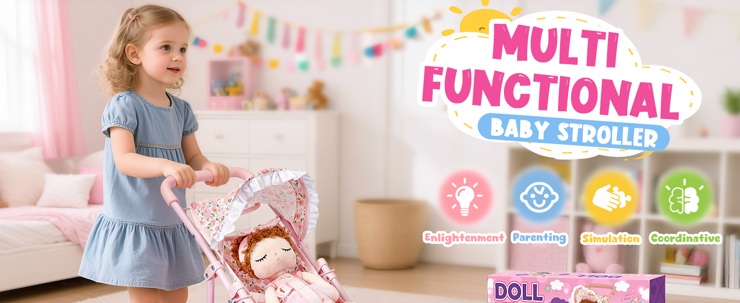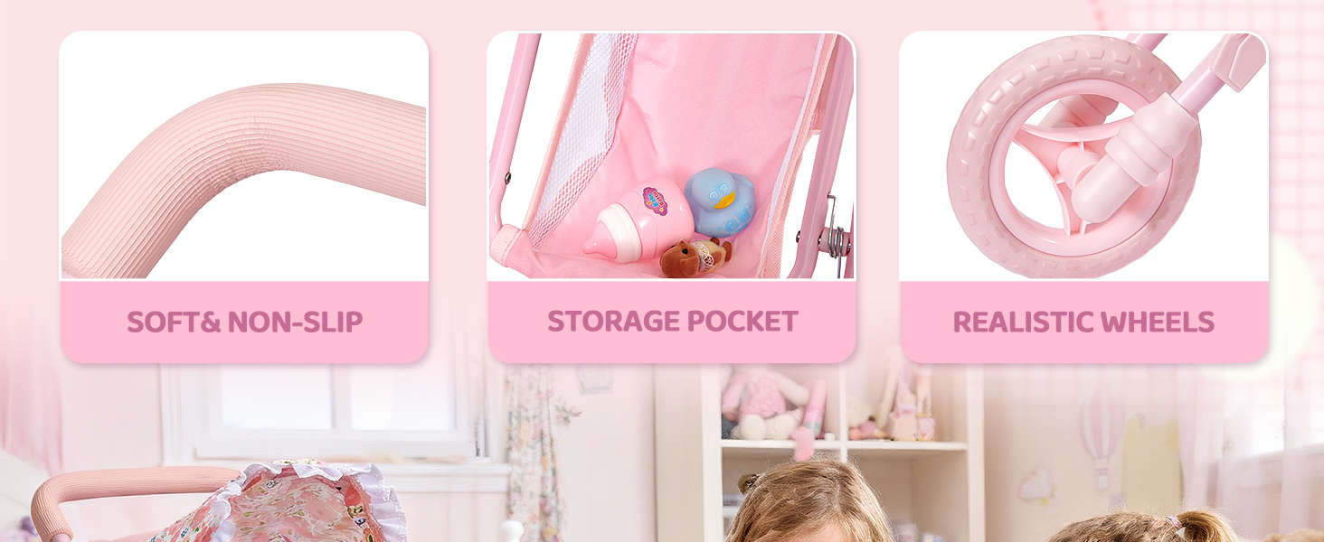 【Enhancing Children's Skills】: This baby doll stroller is very lightweight and easy for toddlers aged 3 to maneuver. Through role-playing, children can develop their fine motor skills and language abilities, enjoying the fun of simulating real caregiving scenarios. Meanwhile, the built-in safety harness provides extra security for the doll, ensuring a thrilling adventure.