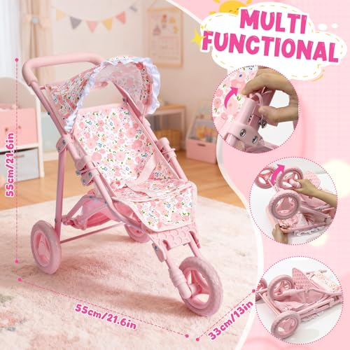 【Premium Dolls Pram for 3 Year Olds Girls】: This toy stroller, approximately 55cm tall with Adjustable Handle, is designed for children aged 3 and up. Its moderate height and sturdy construction ensure children can play freely. As a unique birthday or holiday gift for girls, its realistic stroller design and adorable floral pattern make it even more appealing.