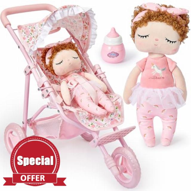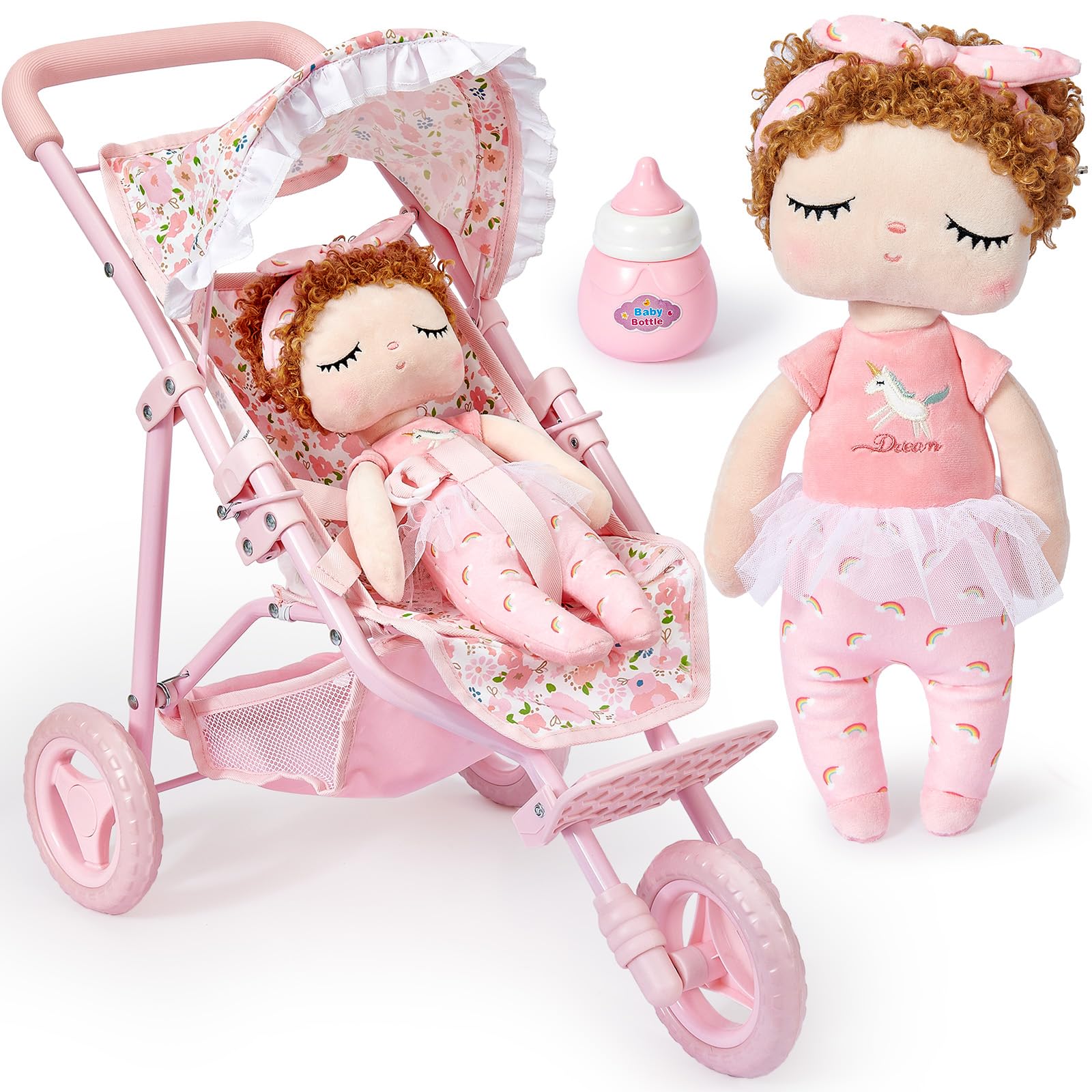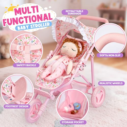 G.C. Dolls Pram for 3 4 5 6 7 8 Year Olds Girls with Rag Doll | Foldable Dolls Pushchair with Adjustable Handle, Storage Basket, Large Wheels, and Canopy | Ideal Role Play Toy Gift for Girls