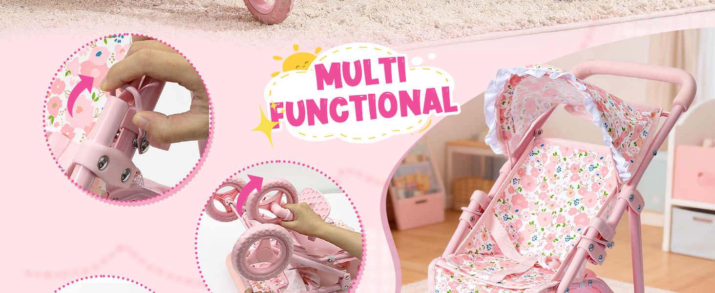 【Portable Foldable Dolls Pushchair】: This pink floral plush toy stroller is ergonomically designed, fun, and easy to carry, ideal for taking to the park or parties. When folded, it can be easily stored in a closet, under a sofa, or in a toy box, suitable for various home environments.