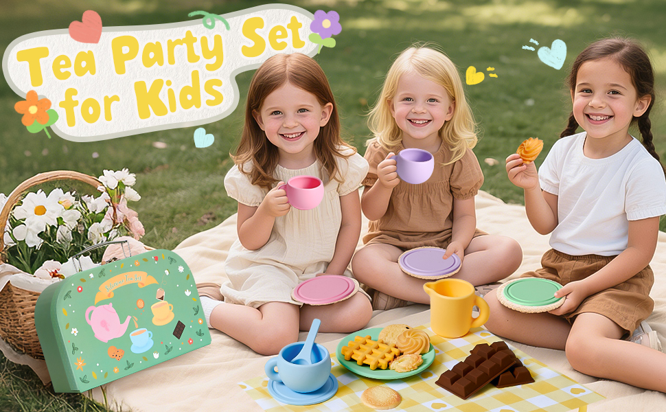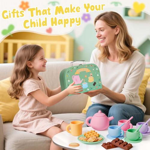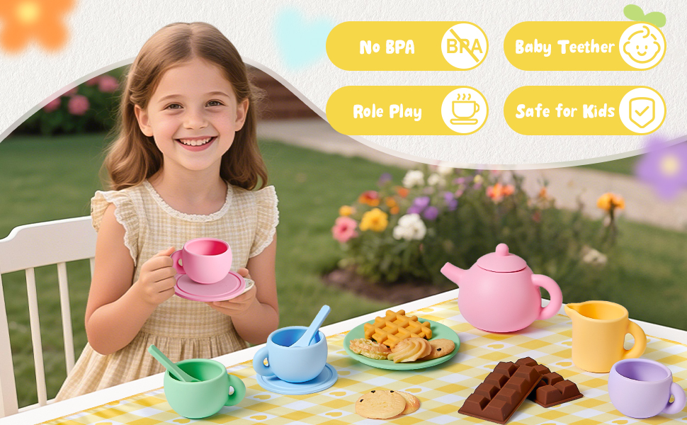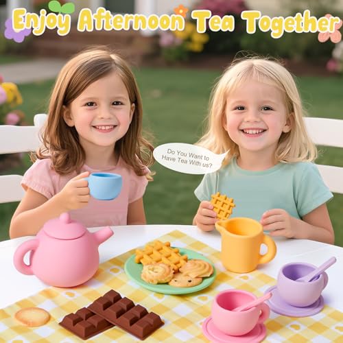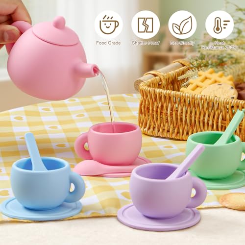 【High Quality Tea Party Set for Children】: This children's tea set is made of food-grade silicone and is more practical than plastic, metal, and wooden toys: It won't leak, corrode, rust, or crack; it's odorless and easy to clean. Children can chew or touch it. The tea set can also be filled with real liquids like water and milk.