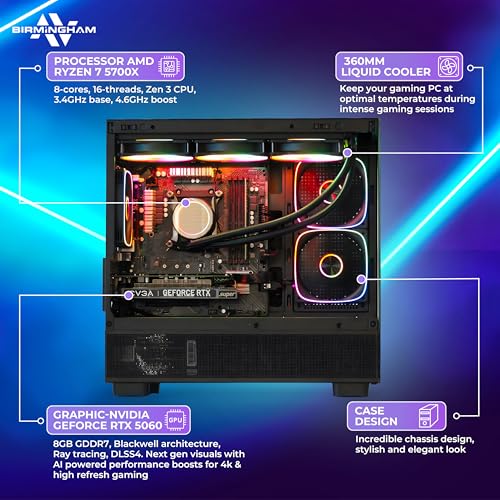Gaming PC Bundle – AMD Ryzen 7 5700X with NVIDIA RTX 5060 8GB, 32GB RAM, 2TB NVMe SSD, Liquid Cooler, RGB Case, Windows 11 Pro – Black