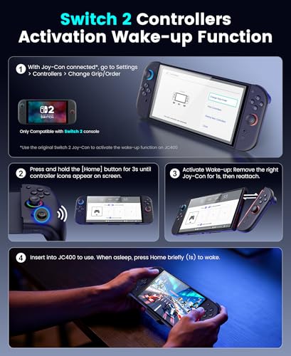 - Wireless Switch 2 Controller & Wake-Up Function: Note: Activating the wake-up function requires the use of Switch 2 Joy-C*n controllers (details in product images/videos).Once activated, Press the "HOME" button for 0.5 seconds to instantly wake the console from sleep mode, offering effortless operation