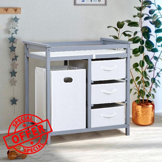 Multi -Functional Changing Table: There are three pull-out storage baskets and one removable hamper under the changing table, which meets your ample storage requirement. You can put towels, diapers, bed sheets, washbasins, and other items that your baby needs in it. It provides you with plenty of storage space to keep your children's things organized and within reach!