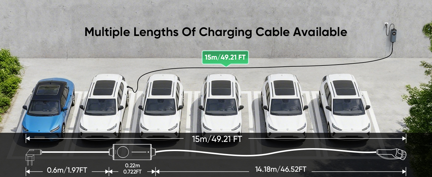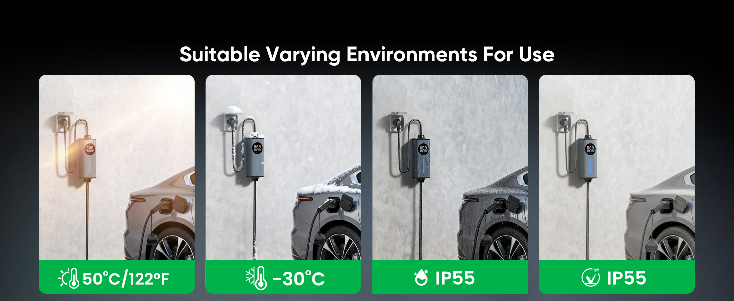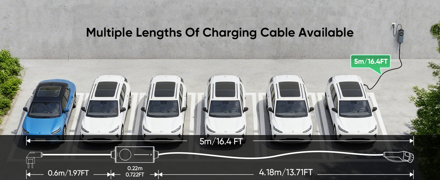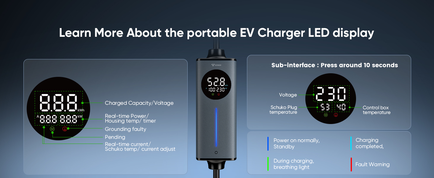 - ⑤ 【LED display with practical Type 2 charging cable】The clear LED screen shows current, voltage, temperature, and charging time in real time. With its 5m Type 2 charging cable to 3 pin plug, this EV car charger provides flexibility for various parking spaces, making electric car charging simple and convenient at home or on the go.