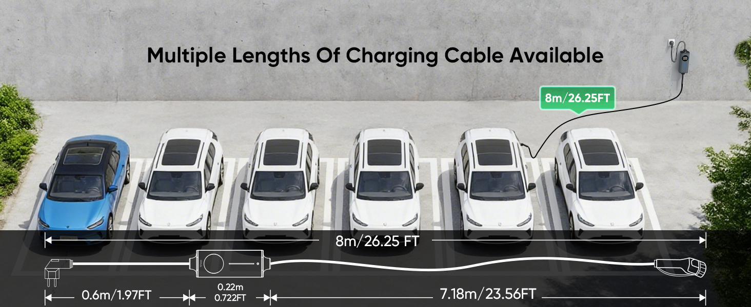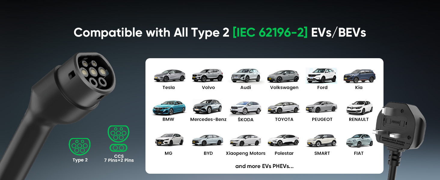 - ⑦【Universal compatibility with all Type 2 EVs】Compatible with every electric car and plug-in hybrid using a Type 2 socket, this charger type 2 UK charger works seamlessly as both a home EV charger and a portable EV charger with 3 pin plug — giving UK drivers a flexible charging solution wherever they are.