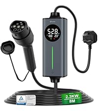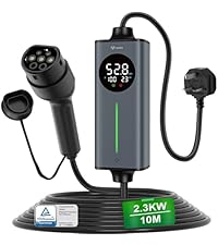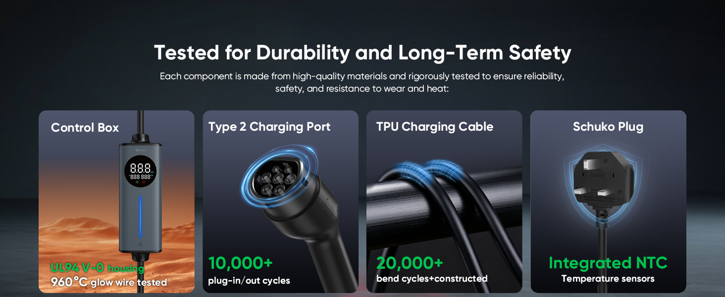 - ④ 【Durable portable EV charger for British weather】Built with a robust TPU cable, silver-plated connectors, and fire-retardant materials, this 2.3kW electric car charger adapter to 3 pin plug is tough and weather-resistant. Perfect as both a reliable home EV charger and a portable EV charging station with no installation required.