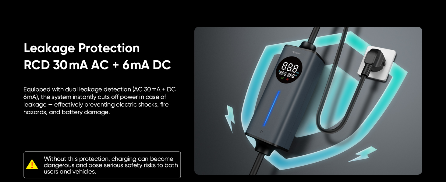 - ②【Advanced RCD protection with AC + DC leakage detection】This portable EV charger offers dual safety protection (AC 30mA + DC 6mA), going beyond standard EV charger cables. Designed as a safe home EV charger and travel companion, it prevents electrical hazards and provides peace of mind while meeting UK electrical safety standards