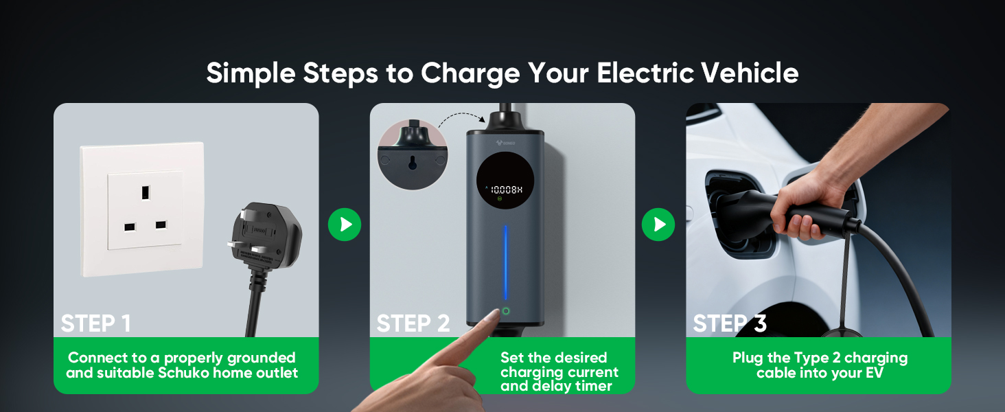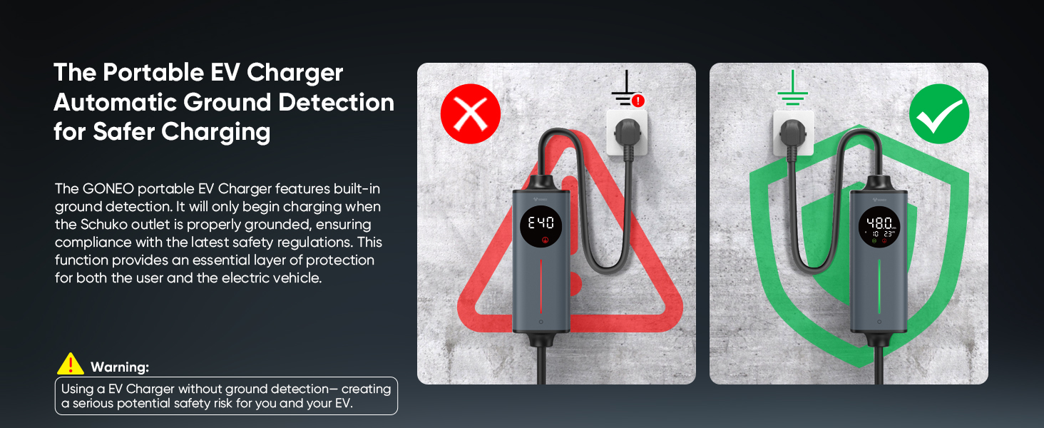 - ③ 【Automatic earth detection with instant alerts】Every time the 3 pin plug of the EV Charger is connected to a UK Socket, an automatic earthing check is performed. A red indicator light instantly signals when a grounding fault occurs, making it easy to charge your electric car or plug-in hybrid safely, with no technical knowledge required.