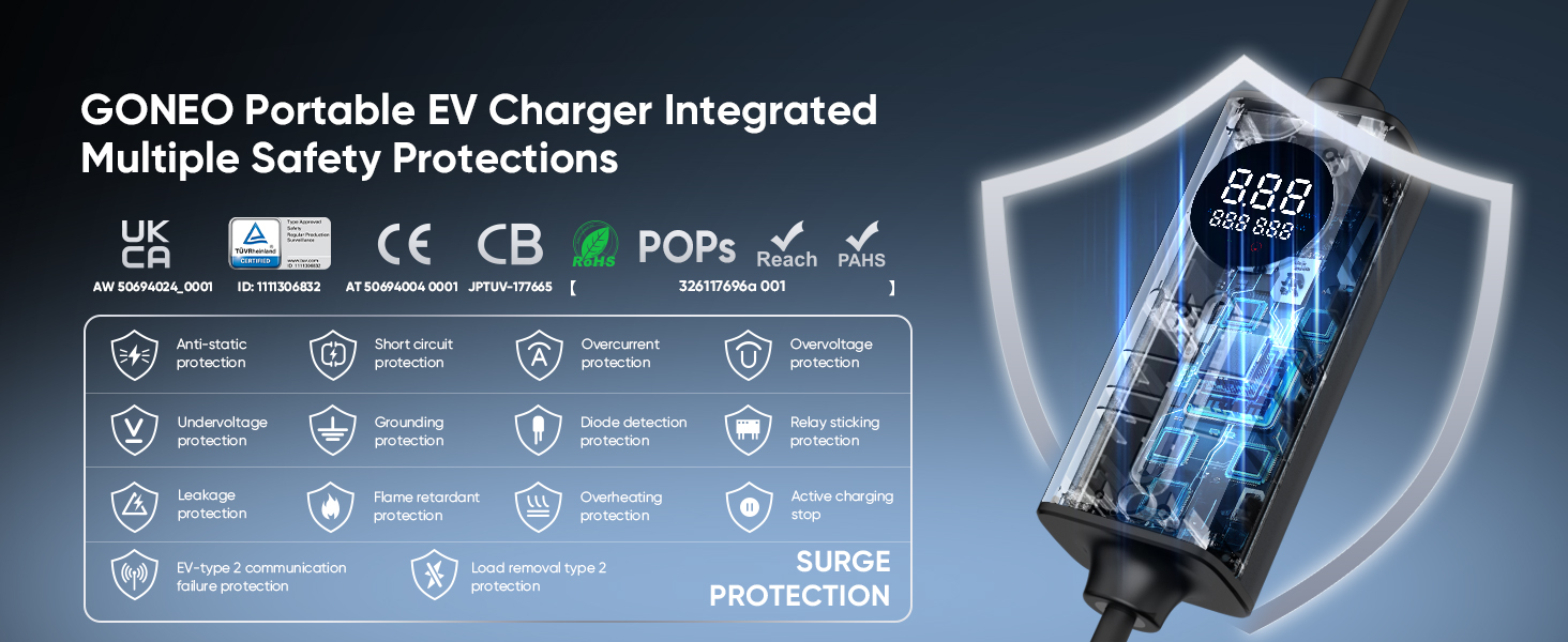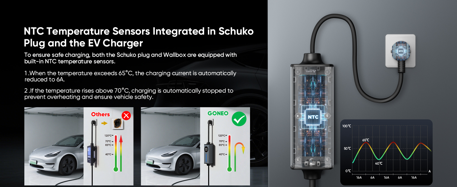 - ①【Smart temperature monitoring for safe EV charging at home】The GONEO portable EV charger with 3 pin UK plug is equipped with intelligent temperature sensors in both the plug and the control box. If overheating is detected, this home EV charger automatically reduces power output, ensuring safe and reliable electric car charging from any standard 10A or 13A domestic socket.