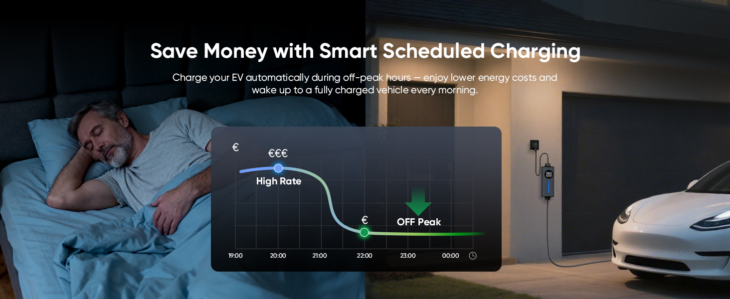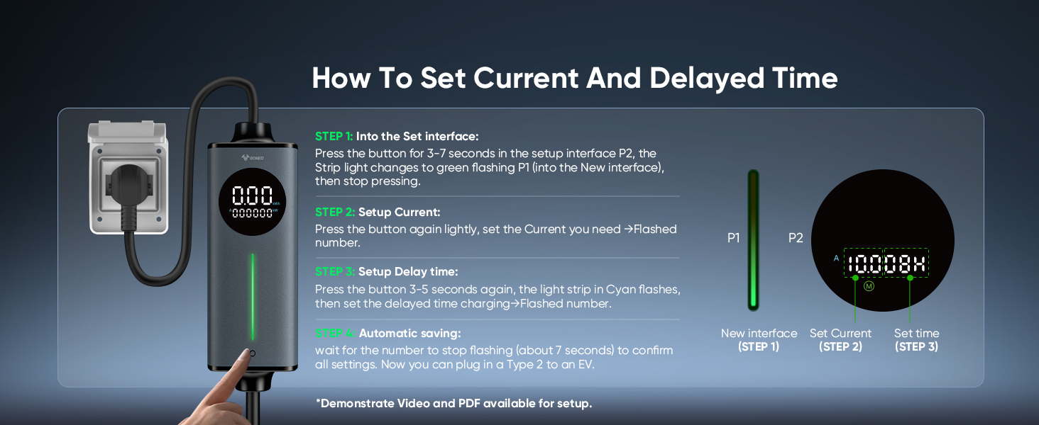 - ⑥ 【Adjustable current settings & smart off-peak charging】Choose between 6A/8A/10A charging modes or set a delay timer (1H/2H/4H/8H) to take advantage of cheaper off-peak electricity. This smart portable EV charger helps you save on energy bills while ensuring your electric vehicle is always ready.