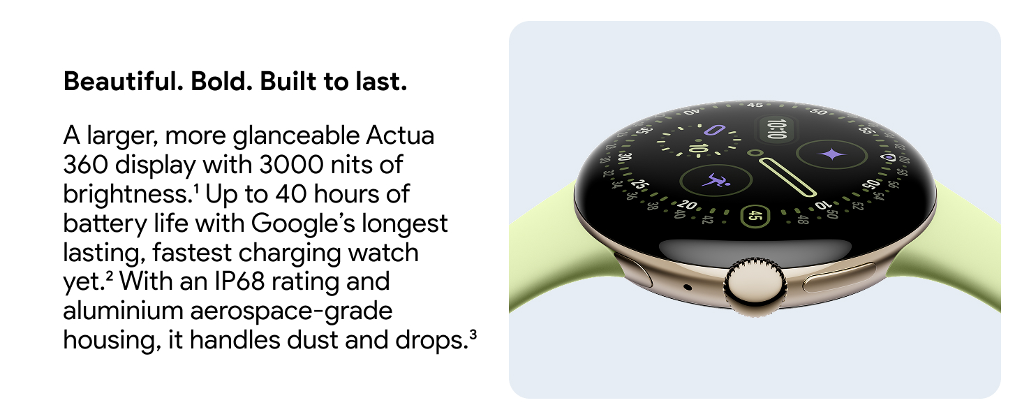 Longest lasting. Fastest charging. With 25% faster charging and Google’s longest battery life yet, the Pixel Watch 4 is ready when you are.