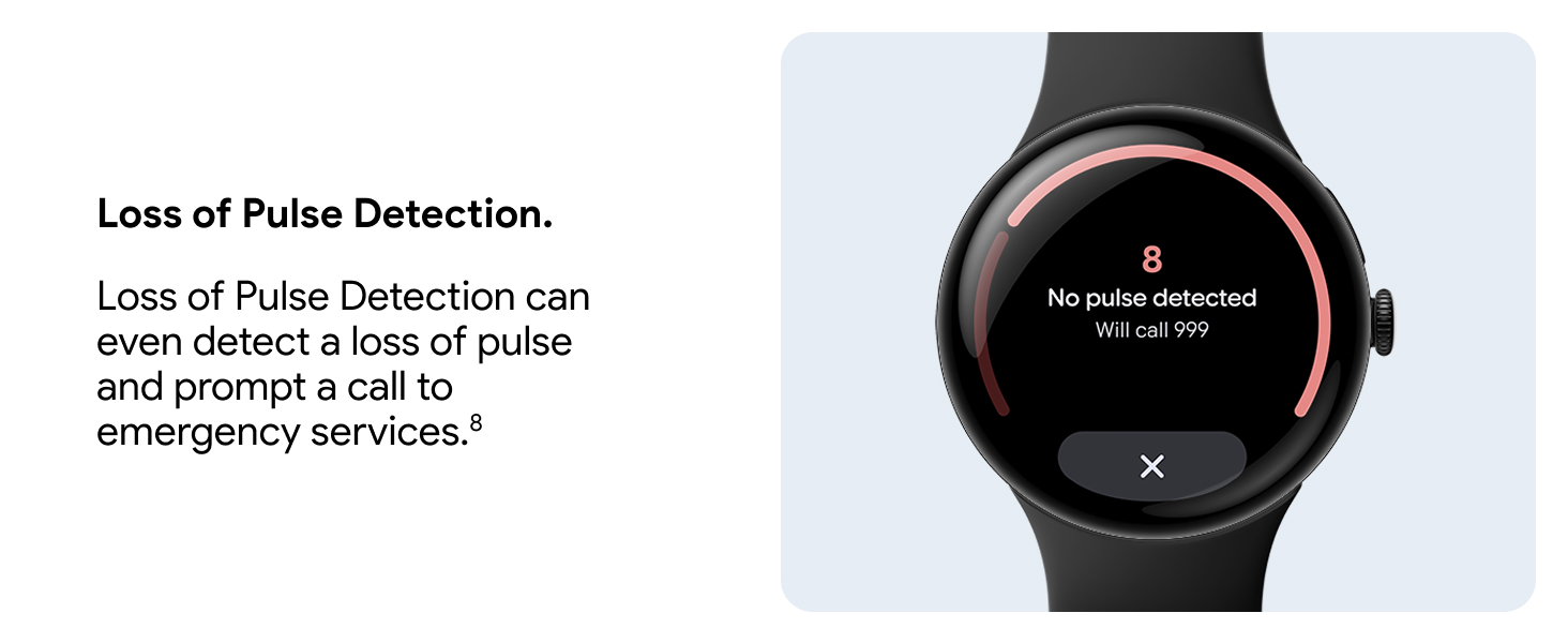Detects loss of pulse, then calls for help. Loss of Pulse Detection can detect a loss of pulse event and prompt a call to emergency services for potentially lifesaving help.