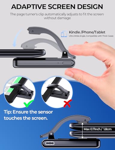 - [ Adaptive Clip Design ]: Our Kindle stand with remote page turner features a smart, screen-sensing clip that automatically adapts to devices up to 0.7 inches thick. Whether used as a Kindle bed holder with remote or as a tablet stand, it ensures smooth page-turning even with thick protective cases
