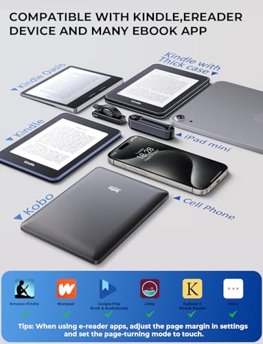 - [ Wide eReader Compatibility ]: This Kindle holder with remote page turner is compatible with Kindle Paperwhite, Kindle Oasis, Kindle Scribe, Kindle 10, Kindle 11, and Kobo devices such as Kobo Nia, Clara 2E, Clara Colour, Libra 2, Libra Colour, and Sage. It also works with capacitive touchscreen eReaders and Kindle apps on phones and tablets, making it one of the most versatile Kindle stands available. Tip: Set page-turning mode to "click to turn page"
