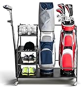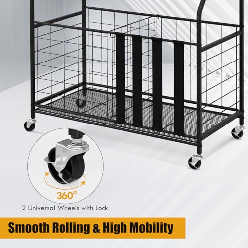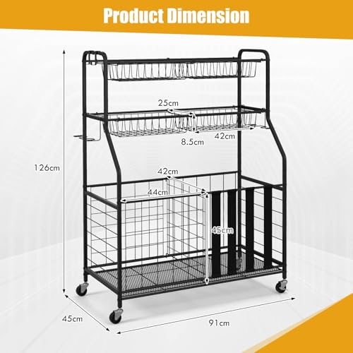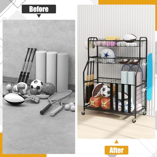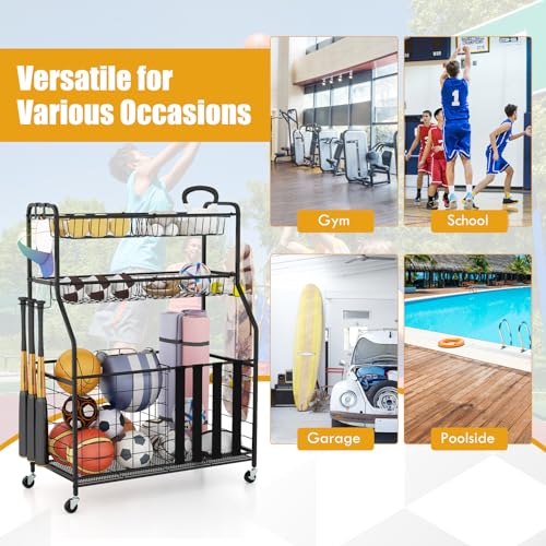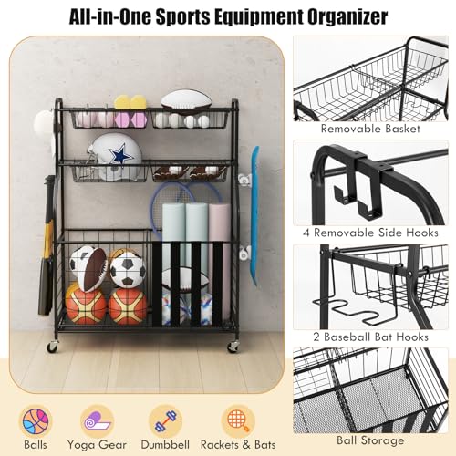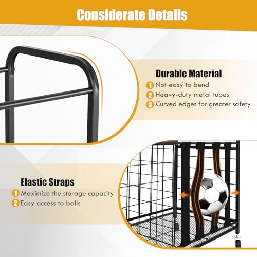 GYMAX Sports Equipment Organizer, Ball Storage Rack with Wheels, Detachable Hooks, Elastic Straps, Basketball Football Gear Holder, Indoor Outdoor Storage Ca
