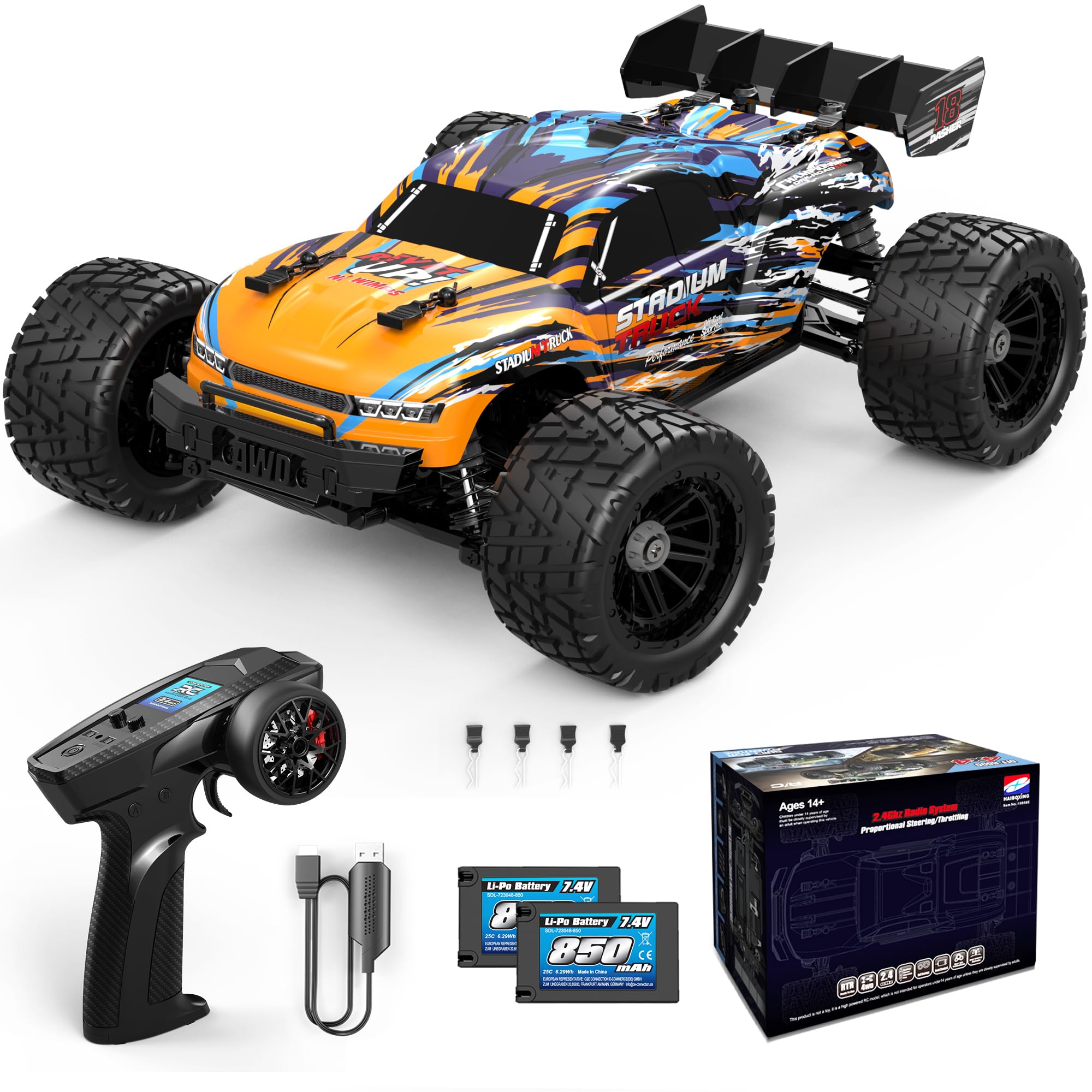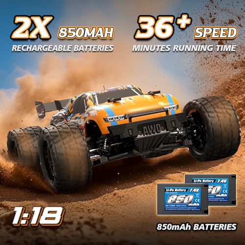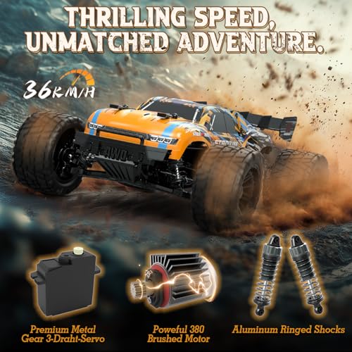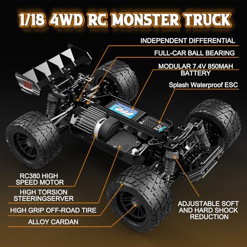 1:18 High-Speed RC Car:Powered with superb all-terrain tires and fast powerful RC 380 motor in unceasingly efficient drivetrain ,this 4WD rc trucks Hailstorm speeds topping to 36 KPH.The fully proportional throttle control allows for smooth acceleration and precise speed adjustments, giving you the edge in any race.It is the best choice for any level monster RC trucks enthusiast.Normal/slow speed switch is specified for beginners and children to pick up