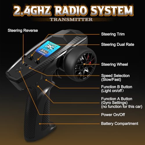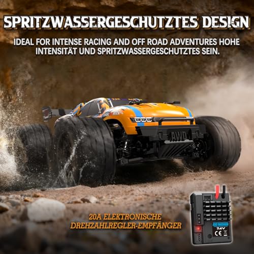 High-Performance Transmission All-Terrain RC Monster Vehicle Car: Featuring High-Torque3-wire Servo with metal gear complement , this car excels in steering, precision and power delivery. It also comes with a separate receiver and a waterproof 20A ESC, current protection and battery low voltage cut off protection.With its SPLASH-PROOF DESIGN and all-terrain tires, it can easily handle complex surfaces like sand, grass, wilderness, and roads,ensuring fun even in rainy conditions