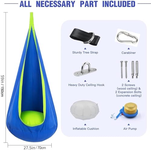 - 【EASY TO ASSEMBLE】 The hanging chair includes a pod swing, an inflatable cushion, an air pump, and all necessary accessories. Complete parts simplify installation and offer a variety of hanging options.