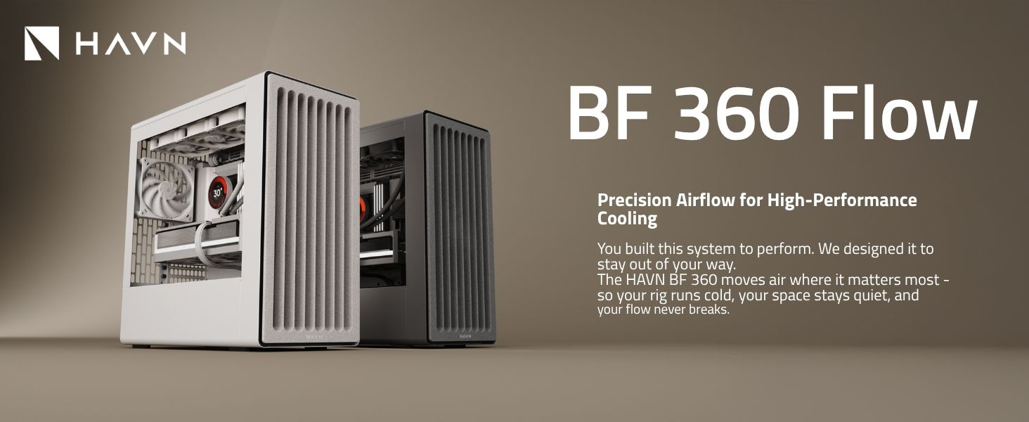 HAVN BF 360 FLOW High Airflow ATX Mid Tower PC Case, Semi-Open SGCC Steel Frame, SimpliCable Cable Management, 2x 180mm Fan, 1x 140mm fan 360mm Radiator Mounts, Magnetic Panels – White